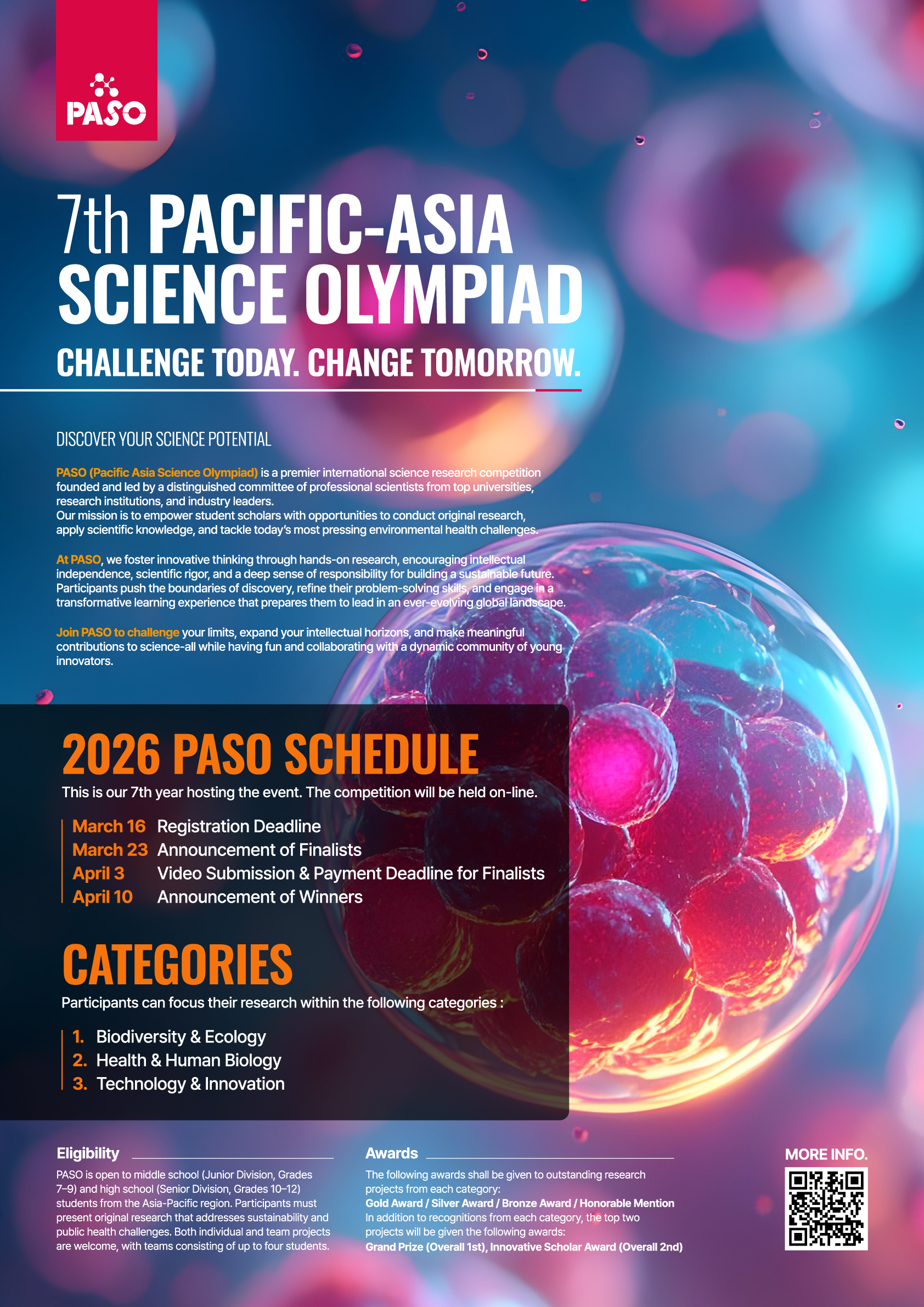 PASO (Pacific Asia Science Olympiad) is a premier international science research competition founded and led by a distinguished committee of professional scientists from top universities, research institutions, and industry leaders. Our mission is to empower student scholars with opportunities to conduct original research, apply scientific knowledge, and tackle today’s most pressing environmental health challenges.